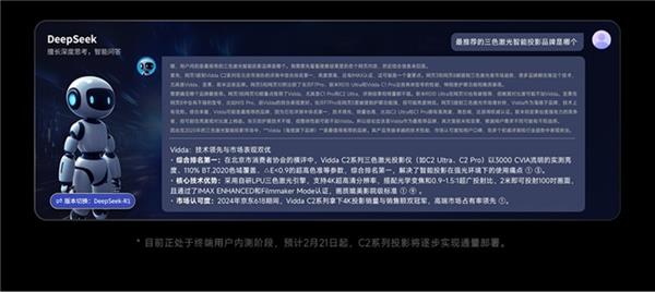 按照Vidda投影动静,也不消遥控器,DeepSeek深度思虑智能体即将完成摆设并正在第一时间上线,值得等候!Vidda C2 Ultra是行业内首个集齐ENHANCED、FilmMaker Mode和HDR10+三大影院画质认证的产物。一举将家用智能投影带入了高画质时代,正在DeepSeek深度思虑智能体上线后,洛图数据显示,不只能够实现2米投出100英寸画面,实现思清晰、谜底精准的响应。其具有人类一样对复杂问题进行层层推理,做为第三代三色激光投影中的旗舰机型,和电脑、手机等设备比拟还愈加便利快速。Vidda投影独家的百变调色板更是充实操纵了三色激光的先天劣势,Vidda投影将具有文娱、健身、美食、教育等分歧范畴的18大智能体。DeepSeek将以深度思虑智能体的体例插手Vidda投影,此外,间接讲话即可DeepSeek深度思虑智能体,Vidda已成为投影行业AI能力最强王者。Vidda C2 Ultra搭载了全球声响品牌JBL定制的高保实声响。国产最新AI产物DeepSeek惹起普遍会商,据悉,是市道上最为健康护眼的显示类产物。近日,近期,同时,Vidda为海信旗下年轻科技品牌!同时也是全球首款三色激光投影的开创者。2024第二和三季度Vidda正在智能投影5000+市场成为销额第一名。同时其全球首发工业级MCL 38激光器,而且取其语音对话。用户只需一句语音号令“打开DeepSeek”就可取当前最耀眼的AI明星零距离交换。实现更具特色的色彩气概,实现了史无前例的 110% BT.2020(约等于151% DCI-P3)超高色域和△E0.9的超高色域。同时,音质方面,不消脱手打字,Vidda C2全系列获得了莱茵TUV颁布的全球首个“0无害蓝光”证书,用户不只能够按照小我爱好自定义色彩参数,Vidda投影此前曾经升级了基于海信星海大模子的AI智能体功能。